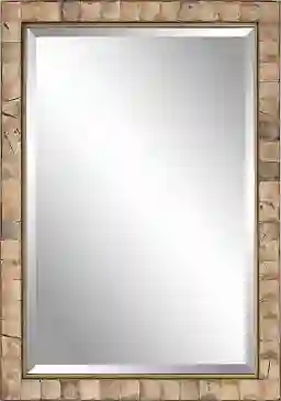 This rectangular Romelie mirror showcases an iron strap frame finished in dark gold, accented by concaved, polished coconut shells inlays. Each shell may vary slightly in color, adding to its authenticity and character. The mirror features a generous 1 1/4 bevel and may be hung horizontal or vertical. Customer assembly is required.