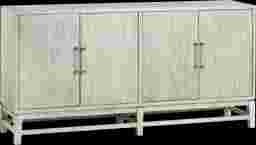 Crafted from solid oak wood, the Rootcloud cream sideboard features a cream finish with brown undertones that highlight the natural wood grain for a refined, organic look. Four doors with European hinges and magnetic closures open to reveal two spacious storage compartments with removable interior shelves. Clear bar handles with chrome accents add a modern touch, while two cord management holes ensure easy device setup. Floor levelers provide stability, and no assembly is required for convenience.