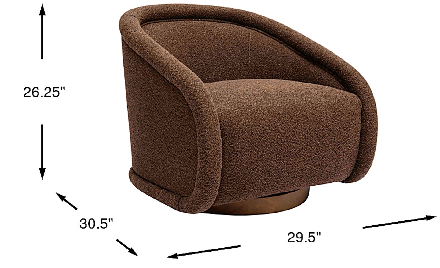 Introducing the Rory brown swivel accent chair. Designed with a solid wood base and a swivel function, its wrapped shelter arm and wide, deep seat offer unparalleled comfort and the perfect space to accessorize with your own pillow. The sensuous sloping back ensures this chair remains a stunning focal point, no matter where it's placed in the room. Customer assembly is required. Upholstery: 100% Polyester.