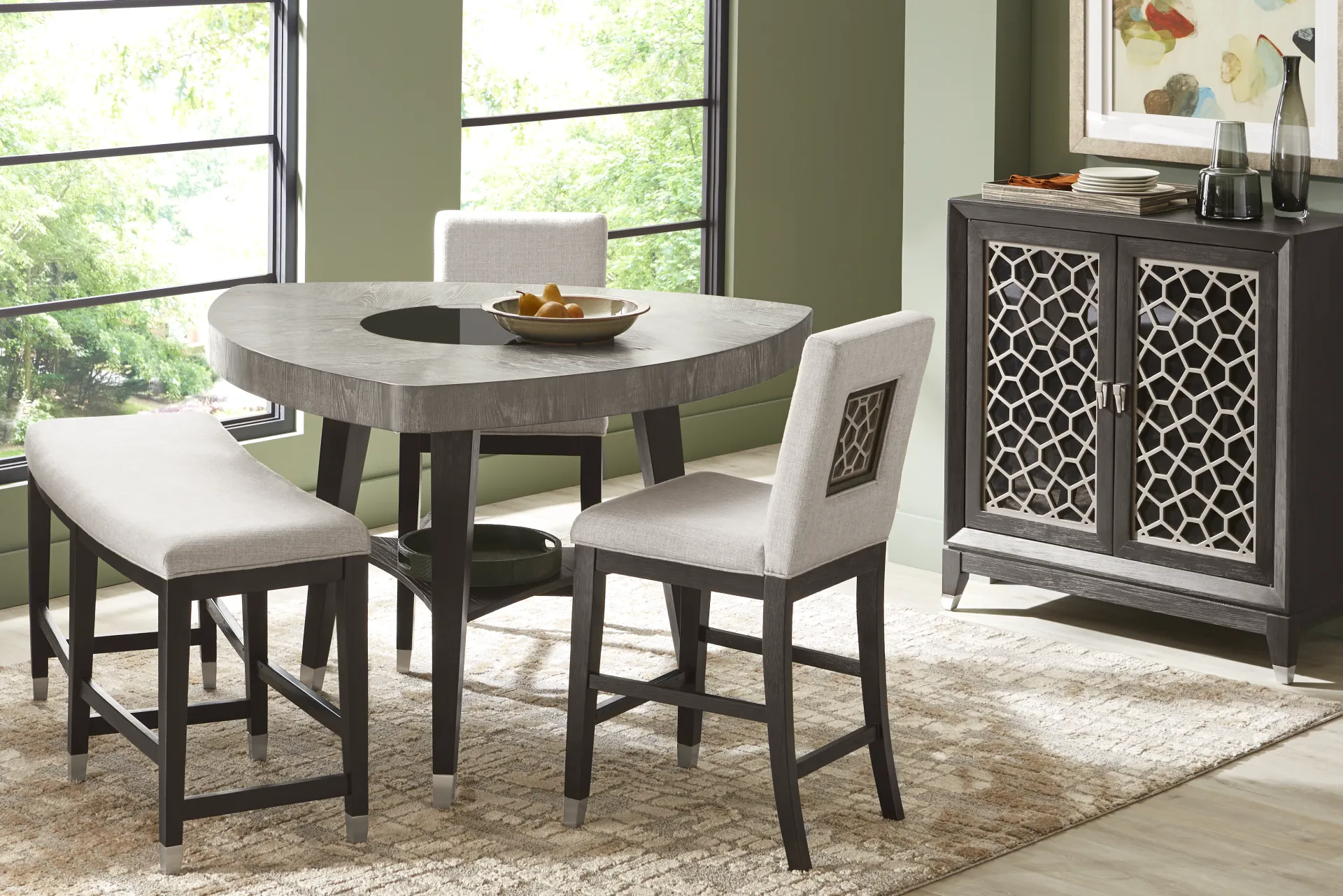 With built-in features and design details to delight guests and family, the Rosalie dining room is a functional work of art that everyone will want to come back to again and again. This contemporary counter height set is beautiful from every angle with a unique triangular shape, contrasting espresso and gray oak veneers, and latticework panels set into the upholstered stools. Diners seated at the table are in for a treat: a glass lazy Susan is built right into the center, perfect for serving family-style meals or showcasing an intricate centerpiece. This set includes two stools and one bench, each with nickel foot caps.