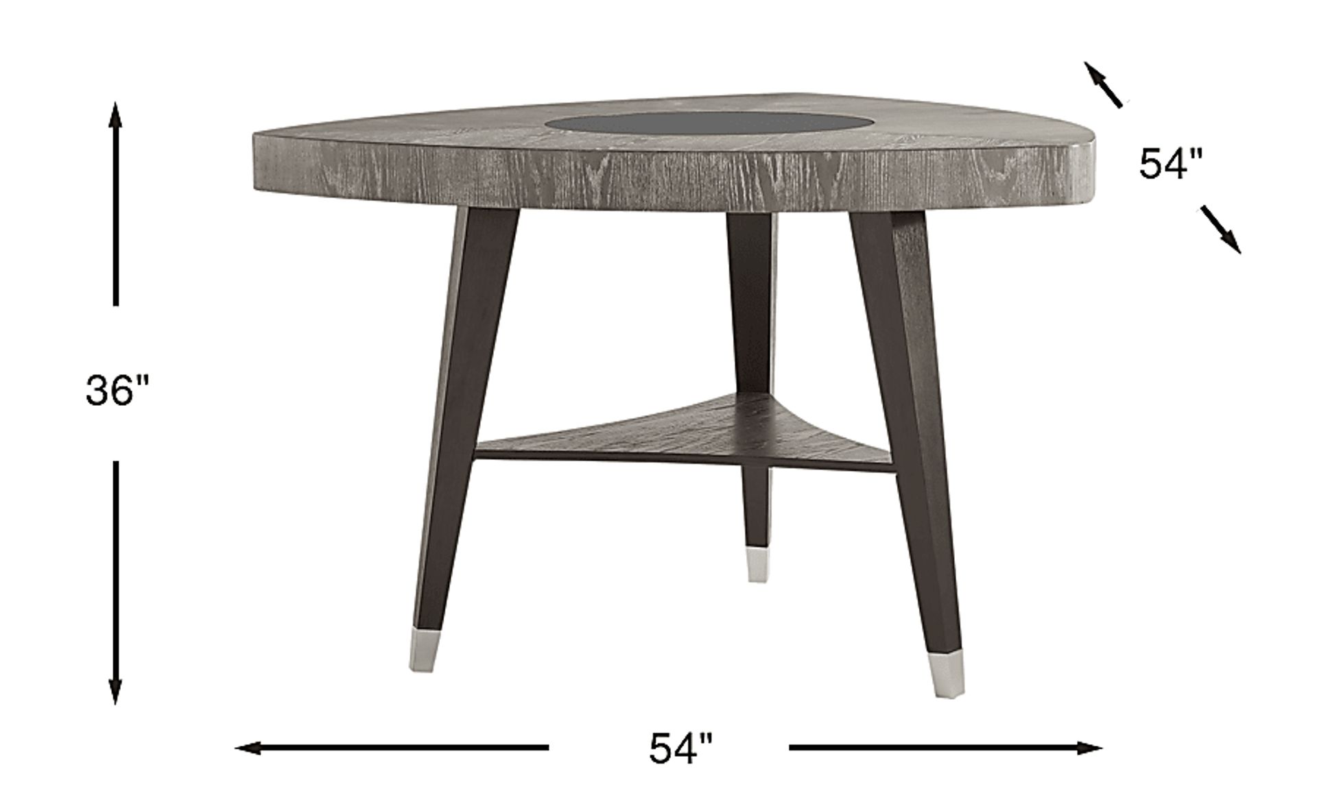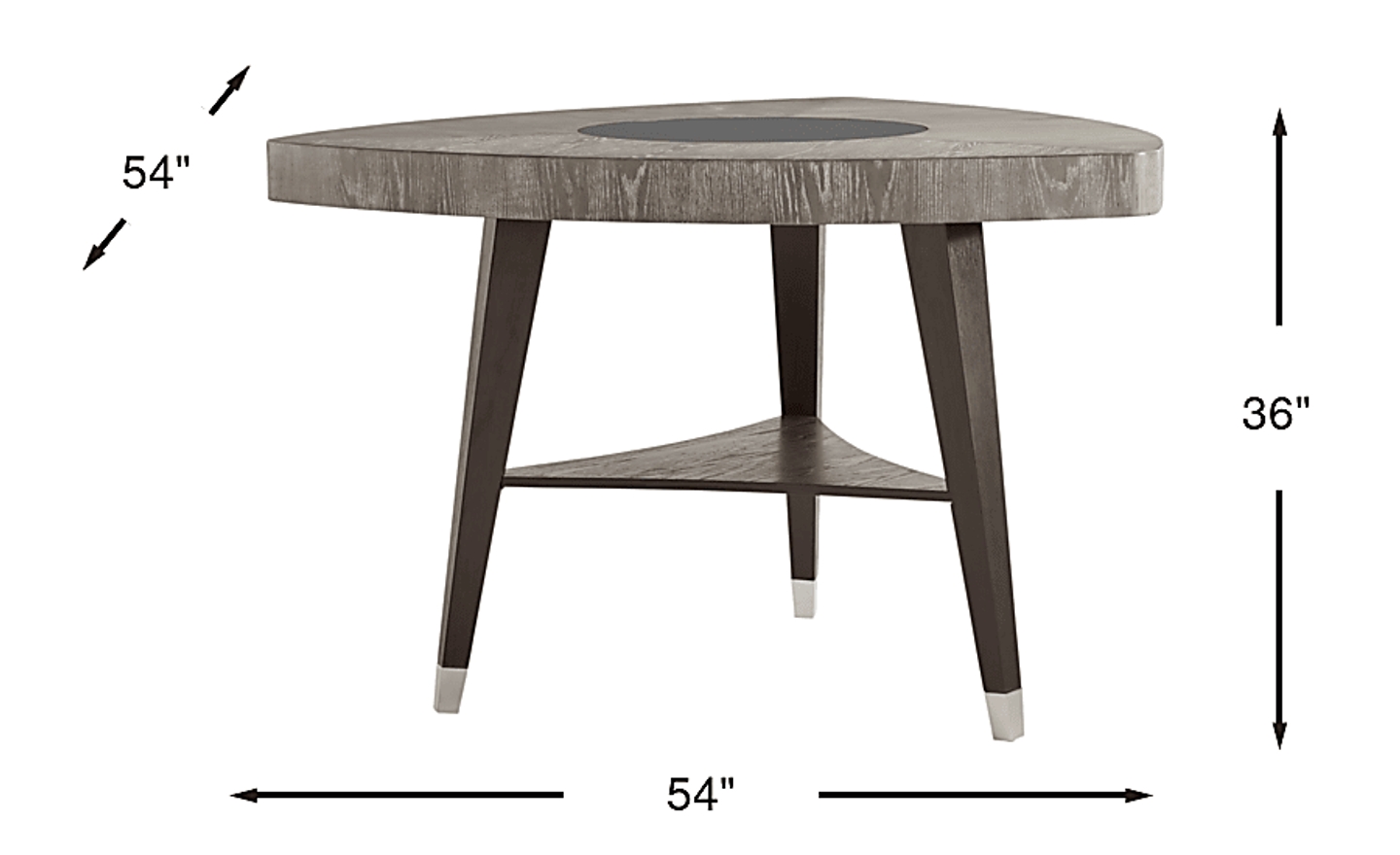 With built-in features and design details to delight guests and family, the Rosalie counter height table is a functional work of art that everyone will want to come back to again and again. This contemporary piece is beautiful from every angle with a unique triangular shape and contrasting espresso and gray oak veneers. Diners seated at the table are in for a treat: a glass lazy Susan is built right into the center, perfect for serving family-style meals or showcasing an intricate centerpiece. Nickel foot caps on each leg complete the look.