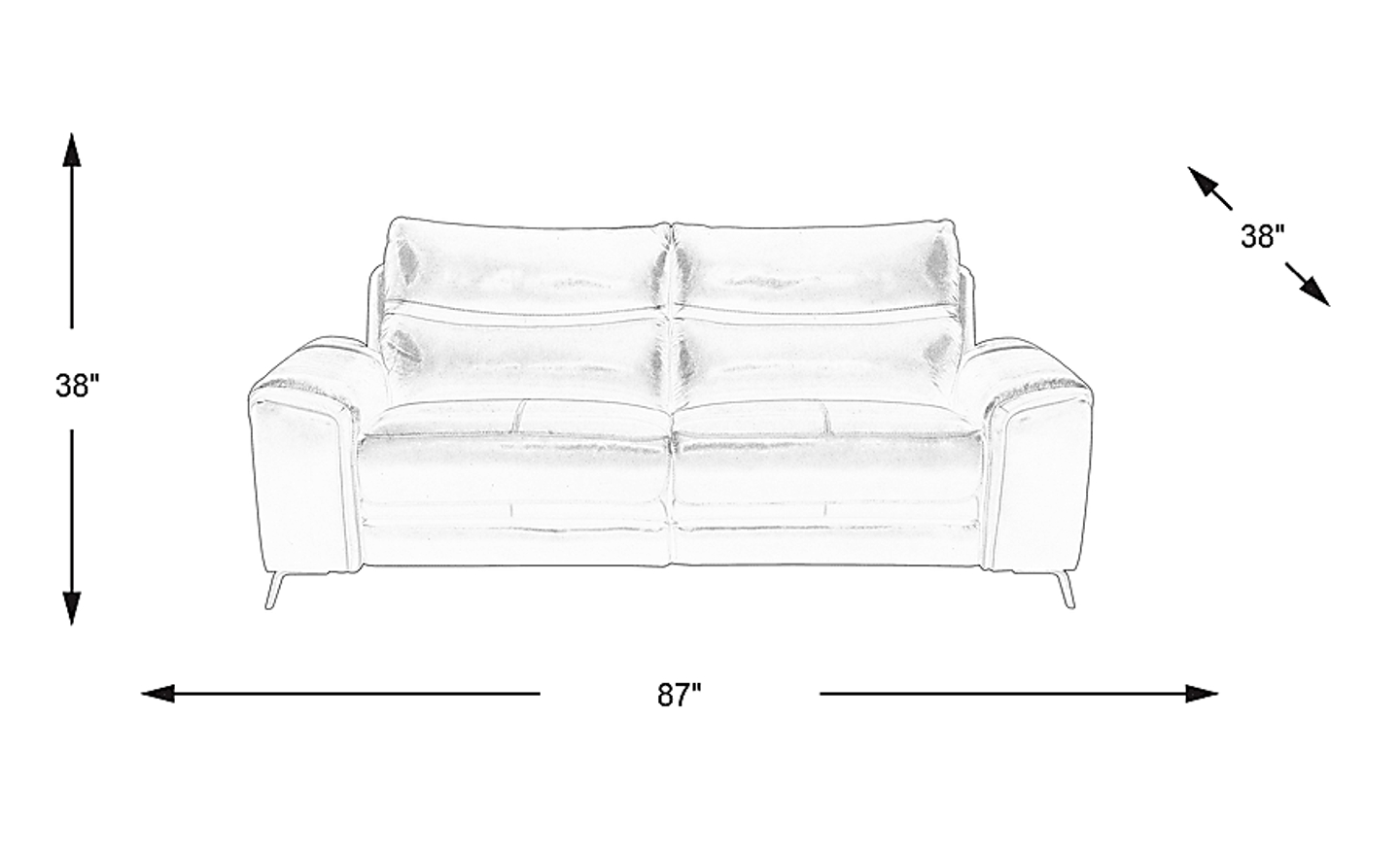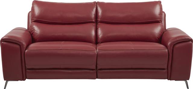 Combining sleek contemporary style with power reclining comfort, the Rosato sofa is a luxurious choice. Sumptuous top grain leather wherever the body touches is offered in a bold red color and features beautiful top stitching detail. For customized comfort, the sofa's padover chaise footrest can be raised and lowered to any position at the touch of a button. A convenient USB port keeps electronic devices charged up and ready to go. Metal legs offer support and reinforce the modern aesthetic. Top Grain Leather Where the Body Touches and Vinyl Sides and Backs.