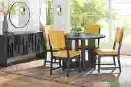Open and inviting with the fresh energy of modern loft, the Rosolli dining room makes meals as delightful as the effortless flow of conversation. Constructed of wood solids and wood veneers in a black finish, this contemporary collection features a dining table with a round tabletop that encourages connection and a crossed pedestal base that gives a modern twist to a classic tavern-style design. Four side chairs showcase upholstered back and seat cushions in a mustard yellow hue for a sophisticated final touch.