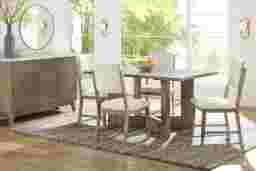 Open and inviting with the fresh energy of modern loft, the Rosolli dining room makes meals as delightful as the effortless flow of conversation. Constructed of wood solids and wood veneers in a grey finish, this contemporary collection features a dining table with a rectangular tabletop that encourages connection and a crossed pedestal base that gives a modern twist to a classic tavern-style design. Four side chairs showcase upholstered back and seat cushions in a soft beige hue for a sophisticated final touch.