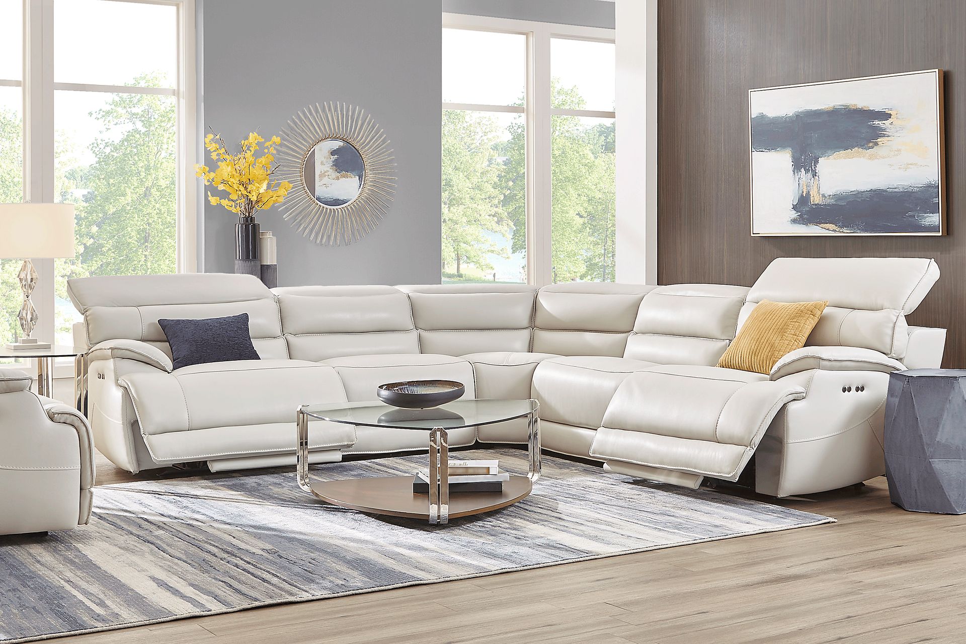 Create a lively living space with the Rossini sectional. Contemporary in style, this piece boasts top grain leather where the body touches. Crafted with dual power adjustable headrests and footrests, Rossini offers customized comfort at the touch of a button. Stitch detailing accentuates this piece as the light gray hue completes the modish look. Top grain leather where the body touches. Vinyl sides and backs.