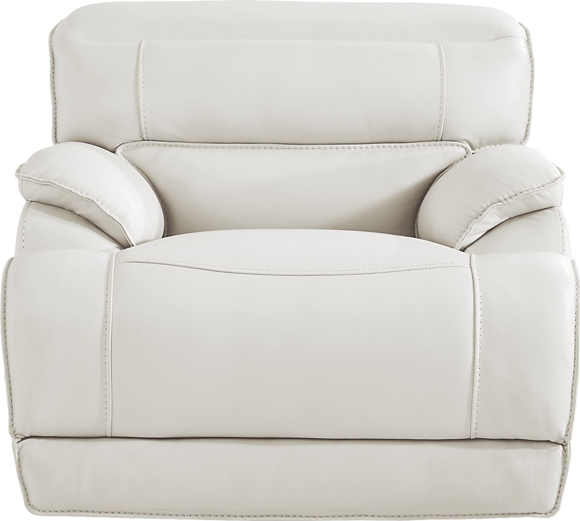 Complete your living space with the Rossini recliner. Contemporary in style, this recliner boasts top grain leather where the body touches. Crafted with dual power adjustable headrests and footrests, Rossini offers customized comfort at the touch of a button. Stitch detailing accentuates this piece as the light gray hue completes the modish look. Top grain leather where the body touches. Vinyl sides and backs.