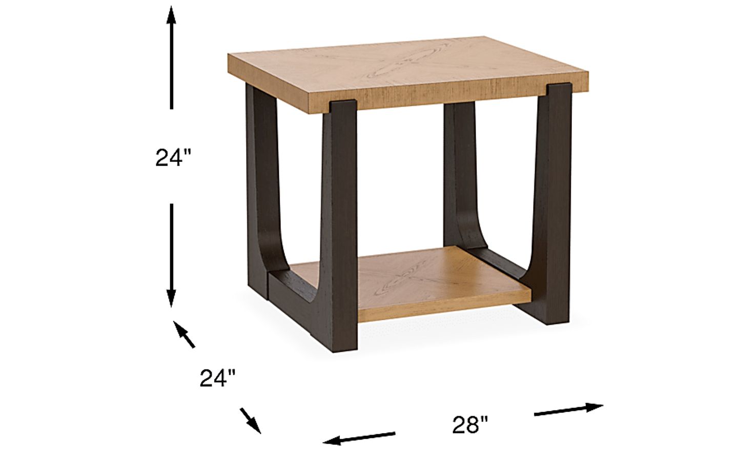 A square end table is an excellent solution for maximizing corner space between a sofa and an accent chair. With a 28-inch width and 24-inch depth, this table provides a generous surface area without a bulky footprint. The open design of the trestle-style legs and the integrated lower shelf create "visual airiness," helping a smaller room feel more open and less cluttered.