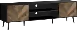 Make a modern statement and stay organized with this Rougemont 72 inch tv stand. Featuring a brown and black laminate finish with durably designed black wood legs, and slanted groove lines on the wood-look doors give this tv console unit a unique and stylish contemporary flair. The two wire management holes behind the fixed shelf provide efficient storage and organization, and the two closed cabinets with a push latch mechanism make opening and closing easy to access books, media and gaming accessories. Customer assembly is required.