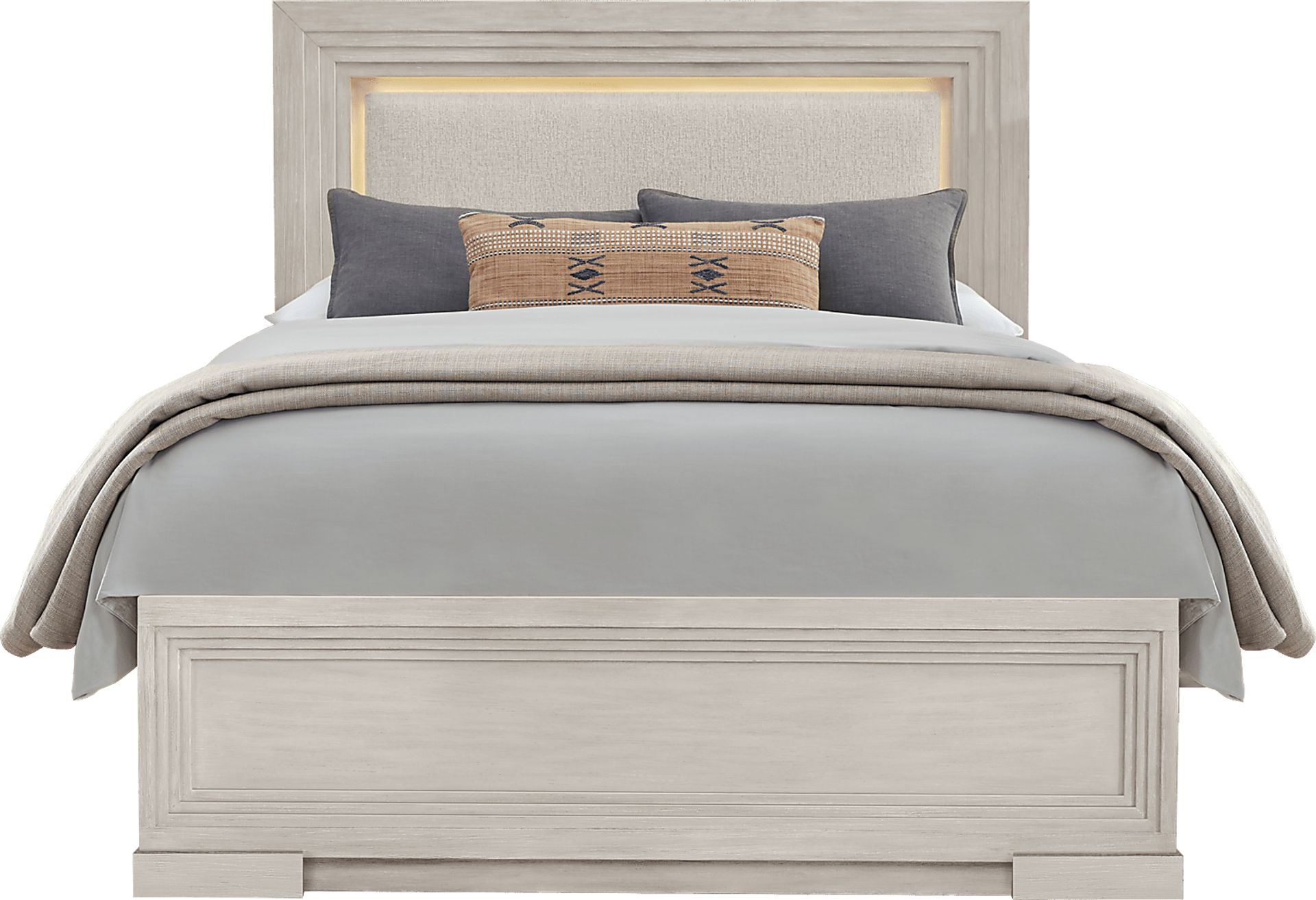 The headboard is designed with a recessed inner panel that conceals integrated LED lights. When turned on, these lights create an elegant "halo effect" around the upholstered section. This feature provides soft, ambient illumination that is ideal for evening reading or creating a tranquil, spa-like atmosphere in your restorative retreat.