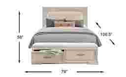 The sculptured look and soothing feel of the Cindy Crawford Home Royal Park bed brings a refined tranquility to your restorative retreat. Showcasing embossed cherry veneers in a subtle champagne finish, this casual contemporary bed features a chic upholstered headboard framed by an inlaid design. A recessed inner panel conceals LED lights that when lit create an elegant, halo effect. Just beneath the footboard's bench, a pair of drawers offer incredible storage for accessories, extra bed linens and more. Mattress and foundation (if required) sold separately. Bed shown is queen size.