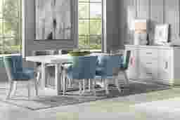 The neutral tones and geometric design of the Cindy Crawford Home's Royal Park dining room create a warm sophistication for all of your mealtime get-togethers. Casually contemporary in style and finished in a beautiful ivory hue, this room features a rectangular dining table anchored by a layered pedestal base that adds depth and dimension to the design. Stylish blue upholstered chairs accentuate the sophisticated look, bringing a luxurious ambiance to your dining experience.