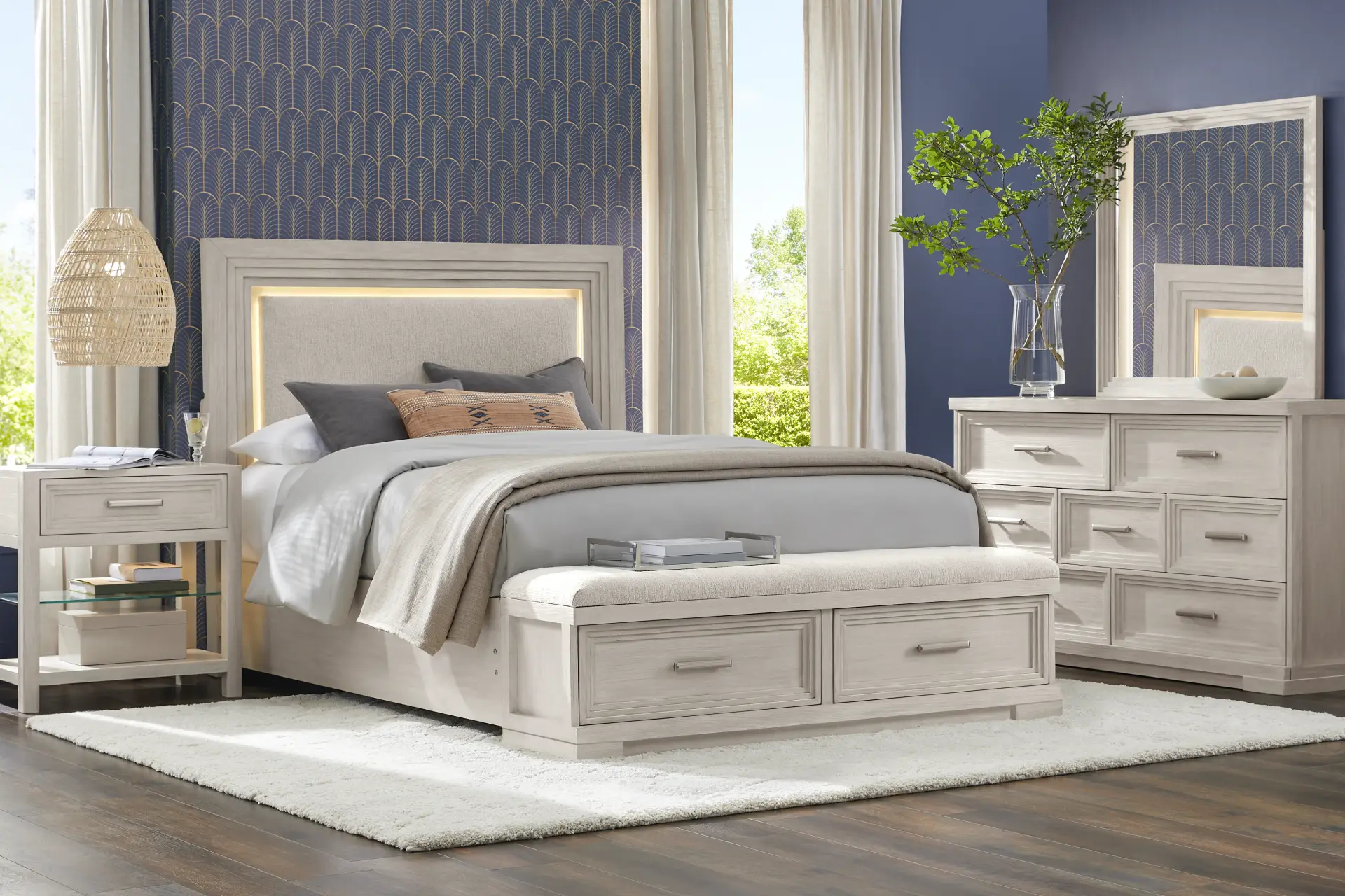 The sculptured look and soothing feel of the Cindy Crawford Home Royal Park bedroom brings a refined tranquility to your restorative retreat. Showcasing embossed cherry veneers in a subtle champagne finish, this casual contemporary room features a chic upholstered headboard framed by an inlaid design. A recessed inner panel conceals LED lights that when lit create an elegant, halo effect. Just beneath the footboard's bench, a pair of drawers offer incredible storage for accessories, extra bed linens and more. The accompanying dresser includes side mounted ball-bearing glides and English dovetail construction for support and longevity. The mirror adds the final touch as its beveled design complements the clean lines and picturesque aesthetic of the room. Mattress and foundation (if required) sold separately.