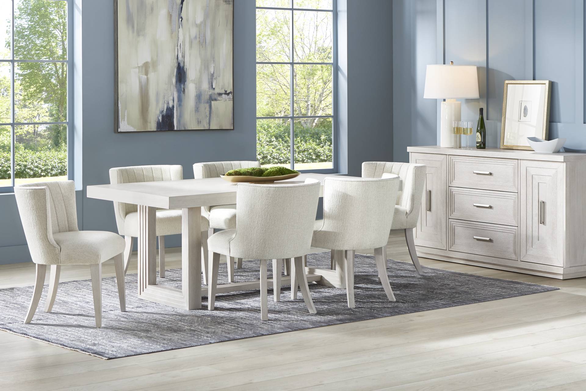 The neutral tones and geometric design of the Cindy Crawford Home's Royal Park dining room create a warm sophistication for all of your mealtime get-togethers. Casually contemporary in style and finished in a beautiful ivory hue, this room features a rectangular dining table anchored by a layered pedestal base that adds depth and dimension to the design. Stylish upholstered chairs accentuate the sophisticated look, bringing a luxurious ambiance to your dining experience.