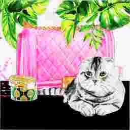Felines and fashion meet in the gorgeous Ruby's Possession artwork, which shows a big grey cat luxuriating beside a pink bag. A houseplant adds a splash of green which makes a great foil for the bright pink- this is certainly a piece for a colorful room. The gentle expression of this cat gives the piece extra 'awww' factor.