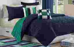 Classic shades of green and blue make the Rugby bed set a great choice to freshen up any full size bed. The ensemble features a reversible full comforter, two shams and two decorative pillows. 100% Polyester
