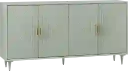 Elevate your space with the Rummele green sideboard, crafted from acacia wood with pine veneer. Its sage green painted finish, enhanced with an oil coating, exudes timeless charm. Featuring four doors with striking diagonal detailing, soft-close European hinges, and sleek gold bar handles, it combines beauty and functionality. Two removable shelves offer customizable storage, while cord management holes keep electronics organized. Floor levelers ensure stability on any surface. Customer assembly is required.