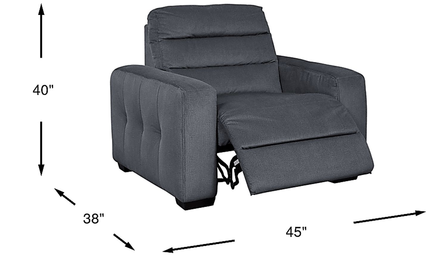 Upholstered in soft navy chenille fabric, the Runyon Canyon power recliner offers an oversized plush spot to kick back and relax. Sleek padded arms and horizontal channeled cushions offer contemporary style and sumptuous comfort, while the lay flat power reclining mechanism with a chaise style footrest keeps you supported from head to toe. A charging USB port on the reclining controls offers added convenience. 86% Polyester, 14% Polypropylene.