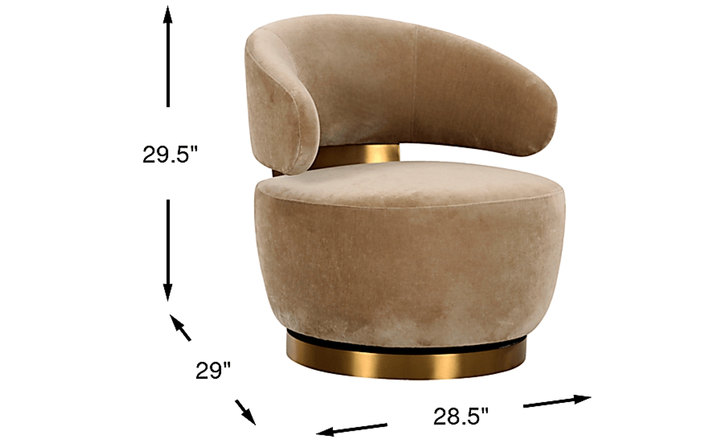 Plush, stylish, and bold, the Russe light brown swivel accent chair is an undeniably unique piece. Its soft and cozy recycled fabric upholstery complemented with brushed gold finishes is timeless and inviting. This eye-catching chair will add a pop of style to any space. Upholstery: 50% Recycled, 50% Virgin Polyester.