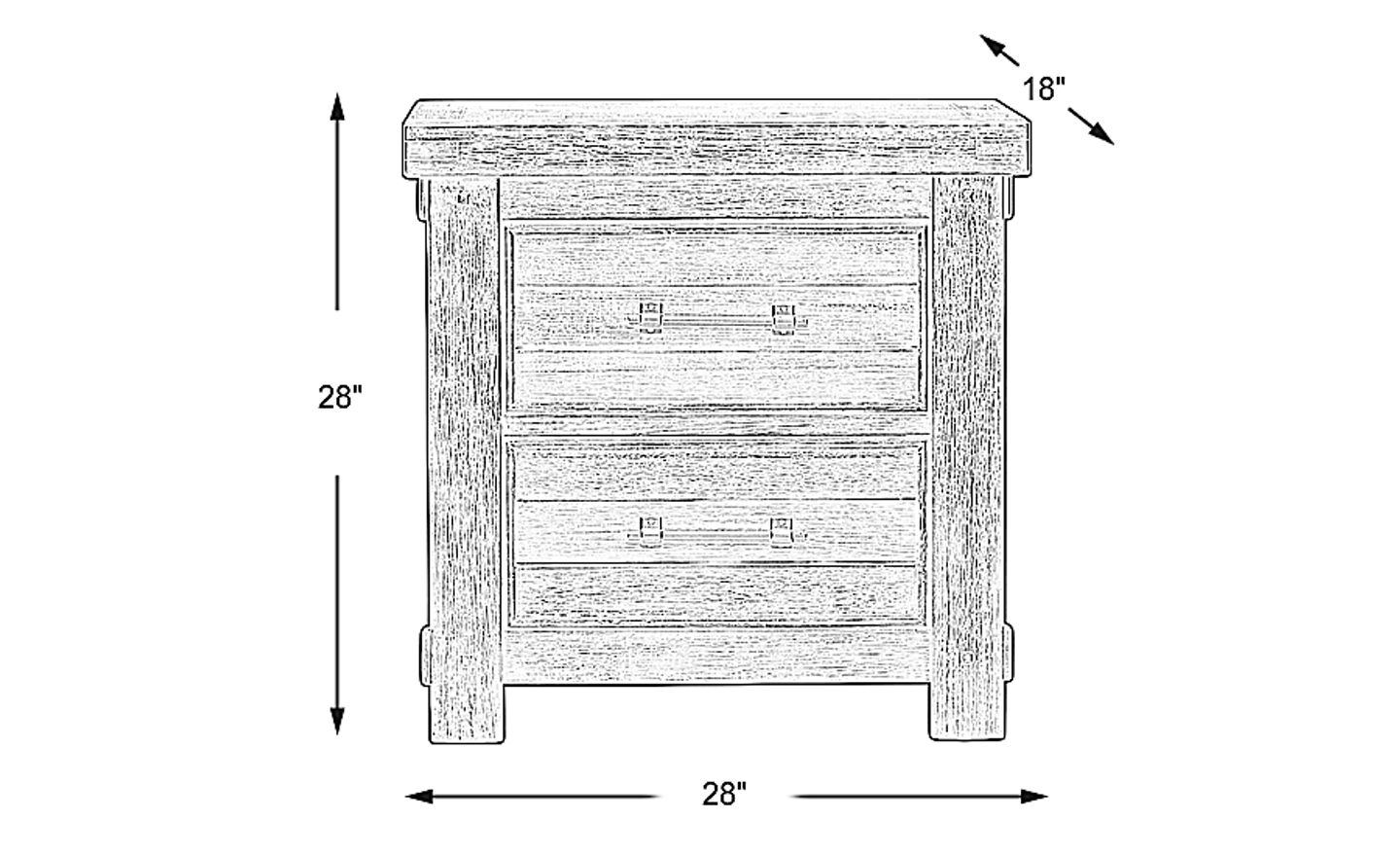 Warm rustic styling and double storage drawers create the appealing Rustic Haven nightstand. This charming bedside piece is made with wood solids and acacia veneers in a tobacco finish. Each drawer is made using French and English dovetail joints for durability. Plank detailing, wooden-style pegs and Industrial-inspired hardware create the look of a reclaimed treasure.