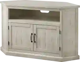 The Rustic Path corner console is designed to maximize space in the living room while not compromising on function and style. Stained in a white finish and constructed from solid New Zealand Pine. An open cubby spans across the TV Stand and offers plenty of room for cable box, gaming systems or a sound bar. The large cabinet design provides for versatile storage options for additional audio, video, gaming components, or other belongings. Ideal for flat panel TVs up to 55". Custom finished black hardware. Features the Lightning Fast Assembly System which allows for easy and fast assembly. Customer assembly required.