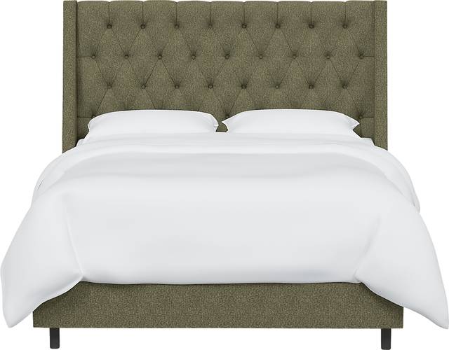 Choose this fully upholstered diamond tufted wingback bed as a dramatic focal point for your private living space. The large footprint and bold design of the decorative Rustic Saddle I bed makes a statement. The headboard and fully upholstered rails attach to the metal bed frame with ease, making it practical as well as pretty. This unique piece is manufactured in Illinois and carefully hand upholstered. Wrapped with lush Woven fabric in army green color, it's a classic look that is both inviting and beautiful. Customer assembly is required. Foundation required. Mattress and foundation sold separately. This piece is made to order and may take up to 6 weeks to deliver.