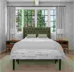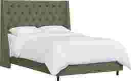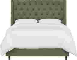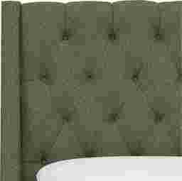 Choose this fully upholstered diamond tufted wingback bed as a dramatic focal point for your private living space. The large footprint and bold design of the decorative Rustic Saddle I bed makes a statement. The headboard and fully upholstered rails attach to the metal bed frame with ease, making it practical as well as pretty. This unique piece is manufactured in Illinois and carefully hand upholstered. Wrapped with lush Woven fabric in army green color, it's a classic look that is both inviting and beautiful. Customer assembly is required. Foundation required. Mattress and foundation sold separately. This piece is made to order and may take up to 6 weeks to deliver.