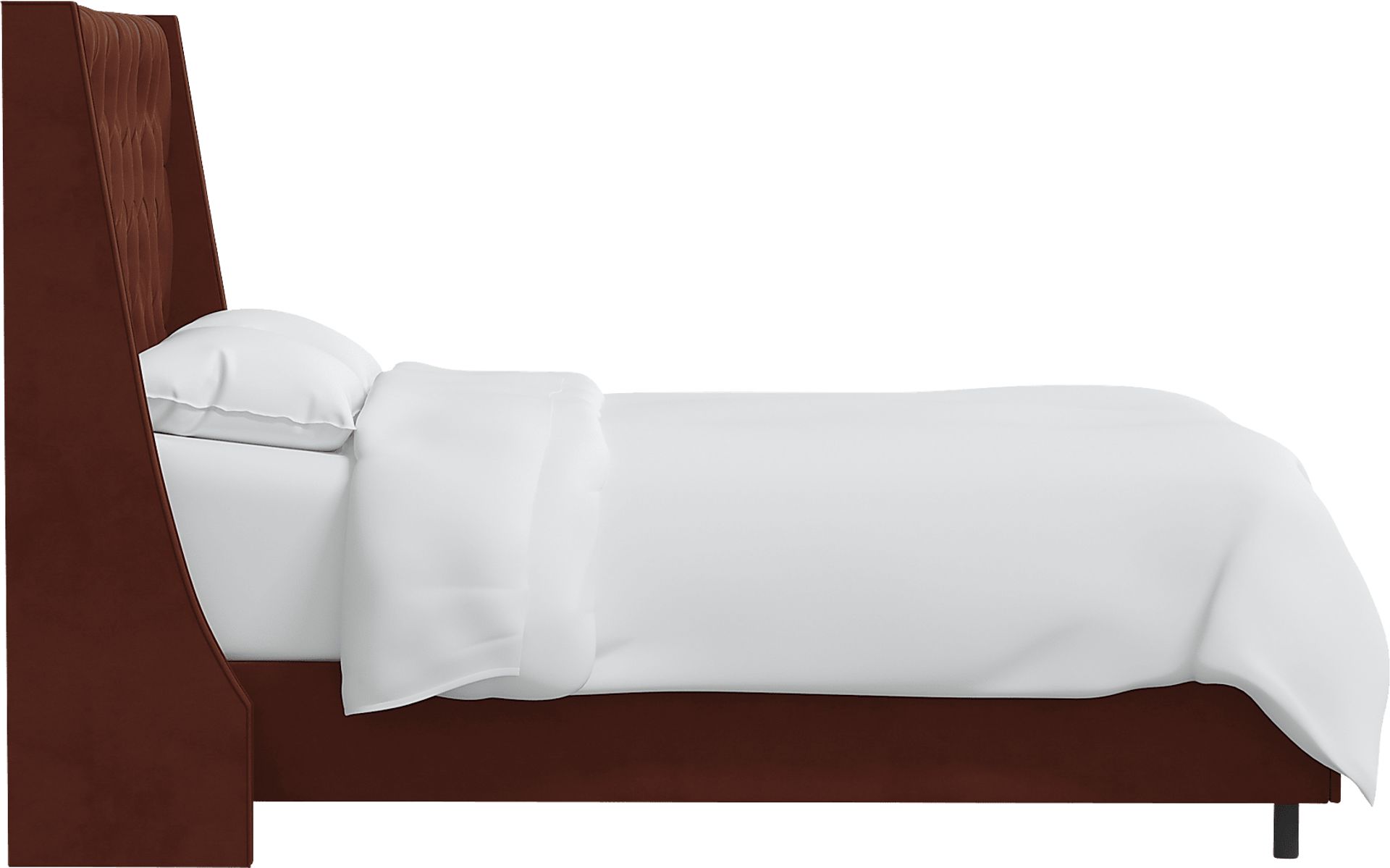 Choose this fully upholstered diamond tufted wingback bed as a dramatic focal point for your private living space. The large footprint and bold design of the decorative Rustic Saddle I bed makes a statement. The headboard and fully upholstered rails attach to the metal bed frame with ease, making it practical as well as pretty. This unique piece is manufactured in Illinois and carefully hand upholstered. Wrapped with lush velvet fabric in burnt orange color, it's a classic look that is both inviting and beautiful. Customer assembly is required. Foundation required. Mattress and foundation sold separately. This piece is made to order and may take up to 6 weeks to deliver.