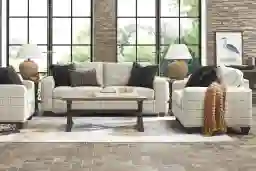 With elevated aesthetics and refined materials combining into an effortless presence, each encounter with the Rutherford living room is a pleasure that lingers long after the lights go out. Its woven beige upholstery gets a dressed-up contemporary look with a charming windowpane check pattern. Sleek track arms enhance the tailored appearance, with reversible seat and back cushions inviting conversations to stretch out and get comfortable. Each seat is completed with poised pyramid feet in black, giving the design a touch of measured contrast. Upholstery: 100% polyester.