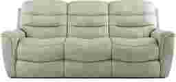 Luxurious leather pairs with comfortable design and premium features on the Sabella power reclining sofa. The contemporary stone colored sofa, upholstered in sumptuous top grain leather where the body touches, boasts customizable comfort thanks to the power reclining feature that raises and lowers the padded chaise footrest with the touch of a button. Padded headrests, pub-style backs and pillowtop arms lend additional cozy comfort for full-body support. Top grain leather where the body touches and vinyl sides and backs.