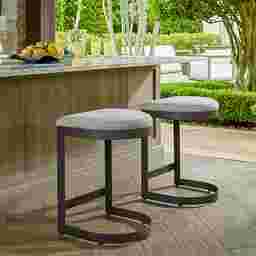 To maintain the stool's appearance, we recommend regularly wiping the powder-coated steel frame with a soft cloth and mild soap and water. For the solution-dyed acrylic cushions, most dirt and debris can be brushed off or cleaned with a simple soap solution. Because the color is embedded throughout the fiber, these cushions are durable enough to handle cleaning with a diluted bleach solution if necessary to remove stubborn stains or mildew, as per standard high-performance fabric care.