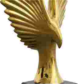 The gold Sabona sculpture features a vibrant gold finish on top of the ceramic figure depicting the mockinjay is mounted on a black base to provide the perfect amount of contrast and make this piece standout even more.