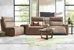 Discover the unlimited possibilities of the dual power reclining ModularTwo, thoughtfully designed with both comfort and flexibility in mind. Contemporary in style and upholstered in a plush suede-soft saddle colored microfiber, its tailored silhouette is enhanced by welted track arms and tufted back cushions for a look of refined elegance and serenity. Each piece is upholstered on all sides, offering endless opportunities for both reconfiguration as well as individual use. Dual power reclining functionality allows for easy adjustment in the headrest and footrest, providing the ultimate in personalized comfort. The center console includes a bluetooth-enabled sound system, retracting cupholders and wireless charging. Select a preconfigured design or visit a showroom to learn about individual components and create the modular solution perfect for your space and style. Upholstery: 100% Polyester.