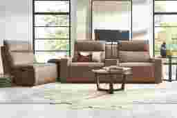 Discover the unlimited possibilities of the dual power reclining ModularTwo, thoughtfully designed with both comfort and flexibility in mind. Contemporary in style and upholstered in a plush suede-soft saddle colored microfiber, its tailored silhouette is enhanced by welted track arms and tufted back cushions for a look of refined elegance and serenity. Each piece is upholstered on all sides, offering endless opportunities for both reconfiguration as well as individual use. Dual power reclining functionality allows for easy adjustment in the headrest and footrest, providing the ultimate in personalized comfort. The center console includes a touch-activated reading light and swivel-top wood table with hidden storage for easy access to your lounging essentials. Select a preconfigured design or visit a showroom to learn about individual components and create the modular solution perfect for your space and style. Upholstery: 100% Polyester