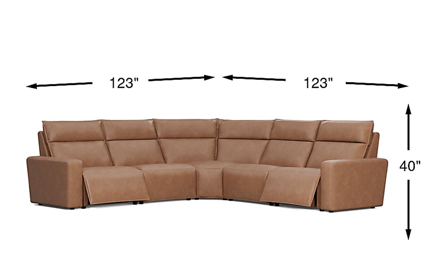 This sectional has a generous footprint of 123" x 123" and features dual power reclining mechanisms for both the headrest and footrest. When planning your layout, ensure there is sufficient clearance behind the unit for the backrest to tilt and in front for the footrest to extend fully. Measuring your space carefully is essential—especially in tighter layouts—to ensure the 40-inch height and reclining motion do not obstruct walkways or wall decor.