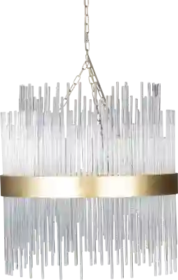 Sleek, cascading spires of glass accented by a ring of gold give the 26" gold iron and glass Saddleback Cove chandelier a vintage feel that adds glamour to any room. Feature this dramatic piece in a grand entryway, opulent master bedroom, or swanky dining room for a chic yet welcoming glow. Durably constructed from iron and glass, this piece adds long lasting beauty and glamour to any space. Recommended to be installed by a professional electrician.