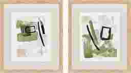 Sage Vibes, green and beige abstract geometric prints are double matted in oyster and white. Framed in a sleek natural wood finish moulding. Customer assembly is required.