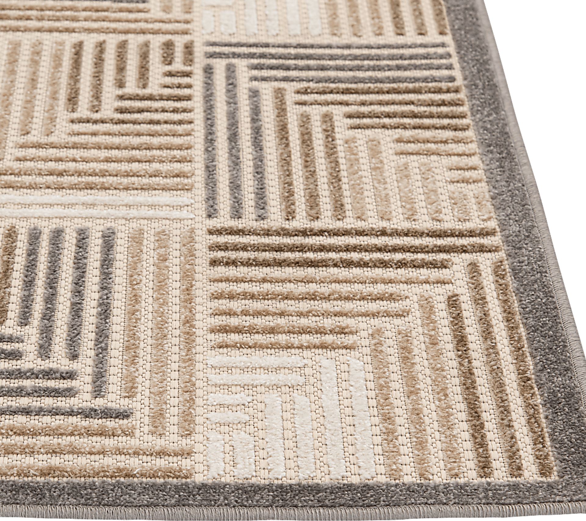 Add depth and dimension to your kitchen, garden, or patio with this beautifully designed and exceptionally durable area rug. Abstract geometric designs in neutral tones of taupe, charcoal, cream, and ivory create a brilliant multidimensional look, and a unique high-low weaving technique adds compelling texture. Whether its a quiet spot in the shade or a busy central dining area, this floor covering lets you infuse a bit of low maintenance, high-end design into your home without fear of staining or fading, even in high-traffic and spill-prone areas. These gorgeous floor coverings are fade resistant, stain resistant, and surprisingly comfortable underfoot thanks to soft polypropylene yarns, so you can spend more time enjoying your space and less time on maintenance. Easy to clean and machine made using state-of-the-art, computer-driven looms, these rugs are sure to maintain their exceptional durability and rich design for years to come. For indoor or outdoor use.