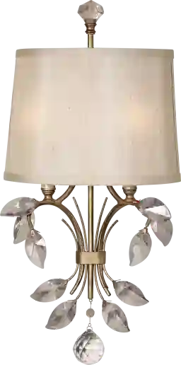 To maximize the visual impact of the golden teak crystal leaves and the silken champagne fabric shade, we recommend mounting the sconce so the center of the fixture is approximately 60 to 72 inches from the floor. This standard placement keeps the detailed "empire" shade at eye level, providing an elegant ambient glow while highlighting the natural slubbing in the fabric.