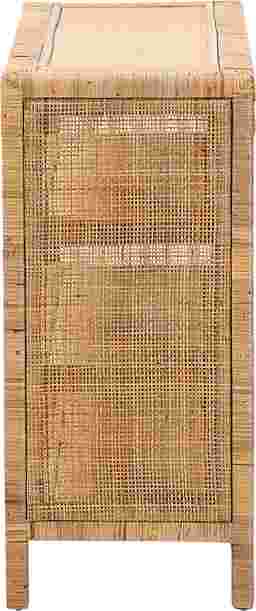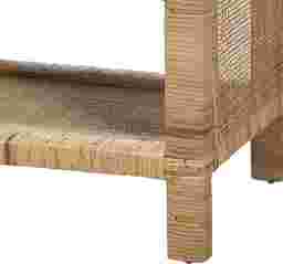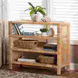 Enliven the ambiance of any layout with the exotic calmness of the Sailbar natural bookcase. This bohemian piece consists of a solid mahogany wood frame wrapped in sustainably sourced natural rattan. Four tiers of shelves offer ample space to beautifully exhibit a variety of household decor while woven rattan panels lend a light, breezy display. The Sailbar will arrive fully assembled and features straight legs for excellent stability and support with crisp geometry. Rattan is a product of nature and may have variations in areas such as, but not limited to, color, pattern, grain and texture. The hair-like strands of rattan/rattan-fiber are common due to the nature of the material.
