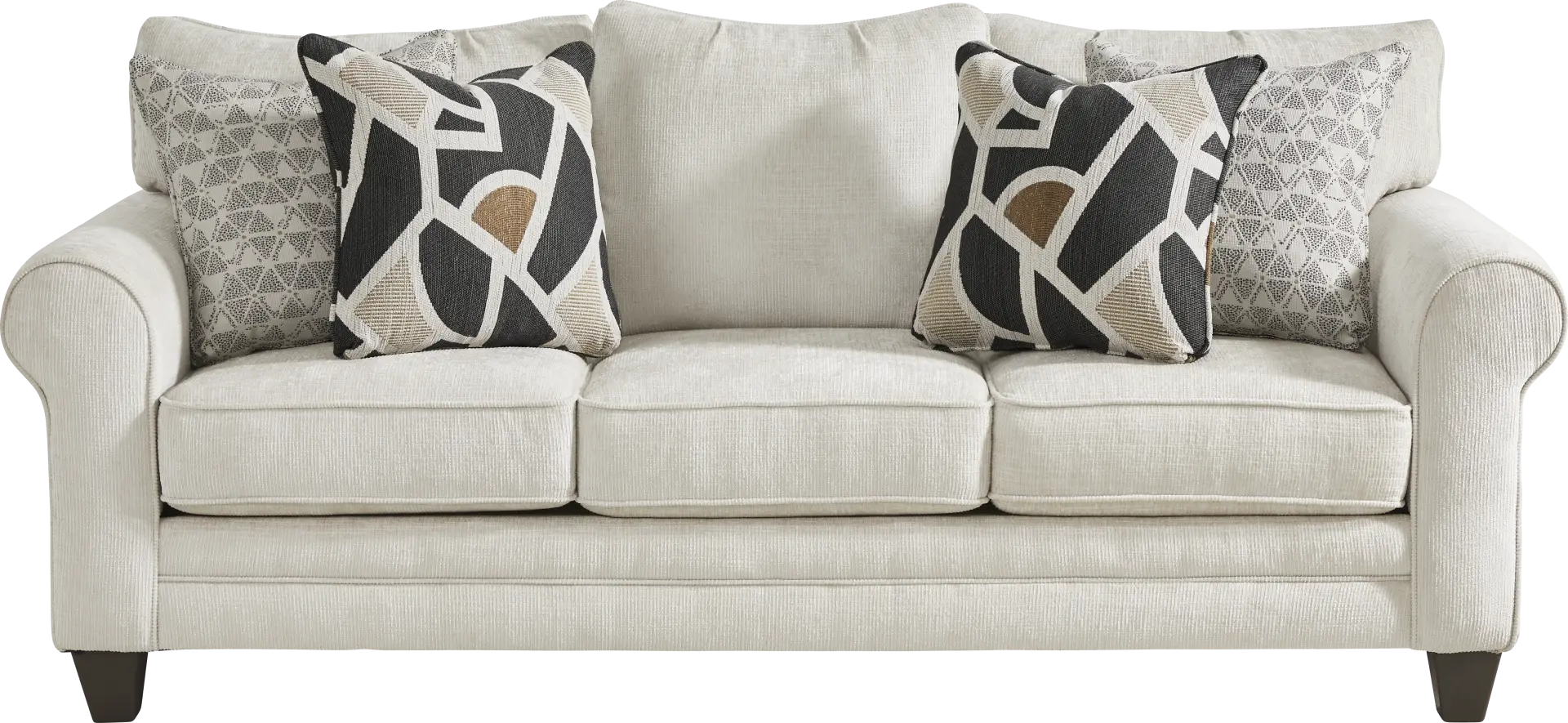 The Salgado Beige Sofa embodies a transitional decor style, blending classic comfort with modern touches. Key design elements include generous roll arms for a traditional flair, clean-lined tapered legs in a dark finish, and refined welted seams. The inclusion of accent pillows adds a pop of contrast and allows for customizable styling.