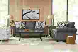 charcoal sofa • charcoal loveseat • Cocktail Table + 2 End Tables • bronze table lamp (2)