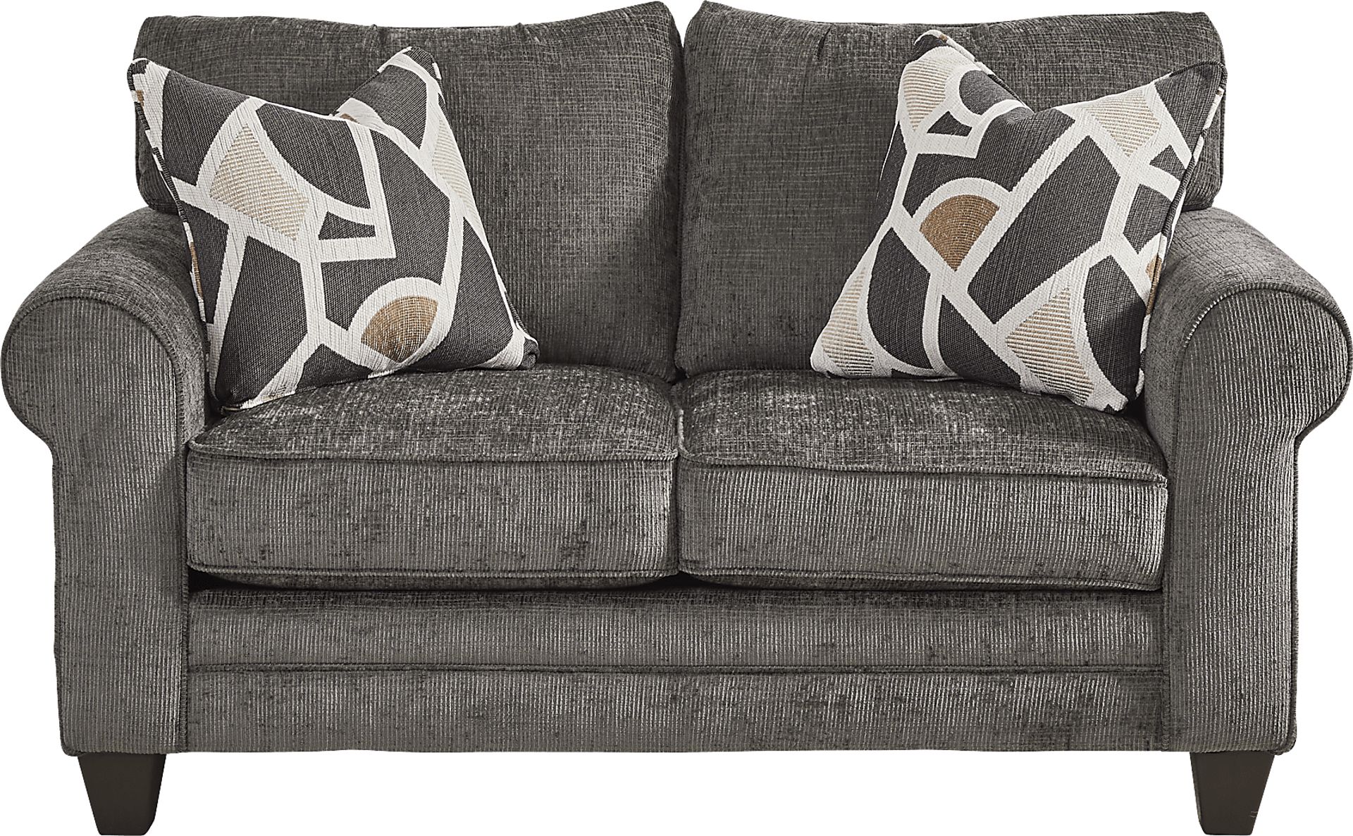 This loveseat features 100% polyester chenille, a synthetic fiber chosen for its inherent durability and resistance to pilling. The tight weave of the fabric makes it more resilient against daily wear and tear from pets and children compared to natural fibers. Additionally, the deep charcoal color is highly effective at masking minor everyday stains or pet hair between cleanings.