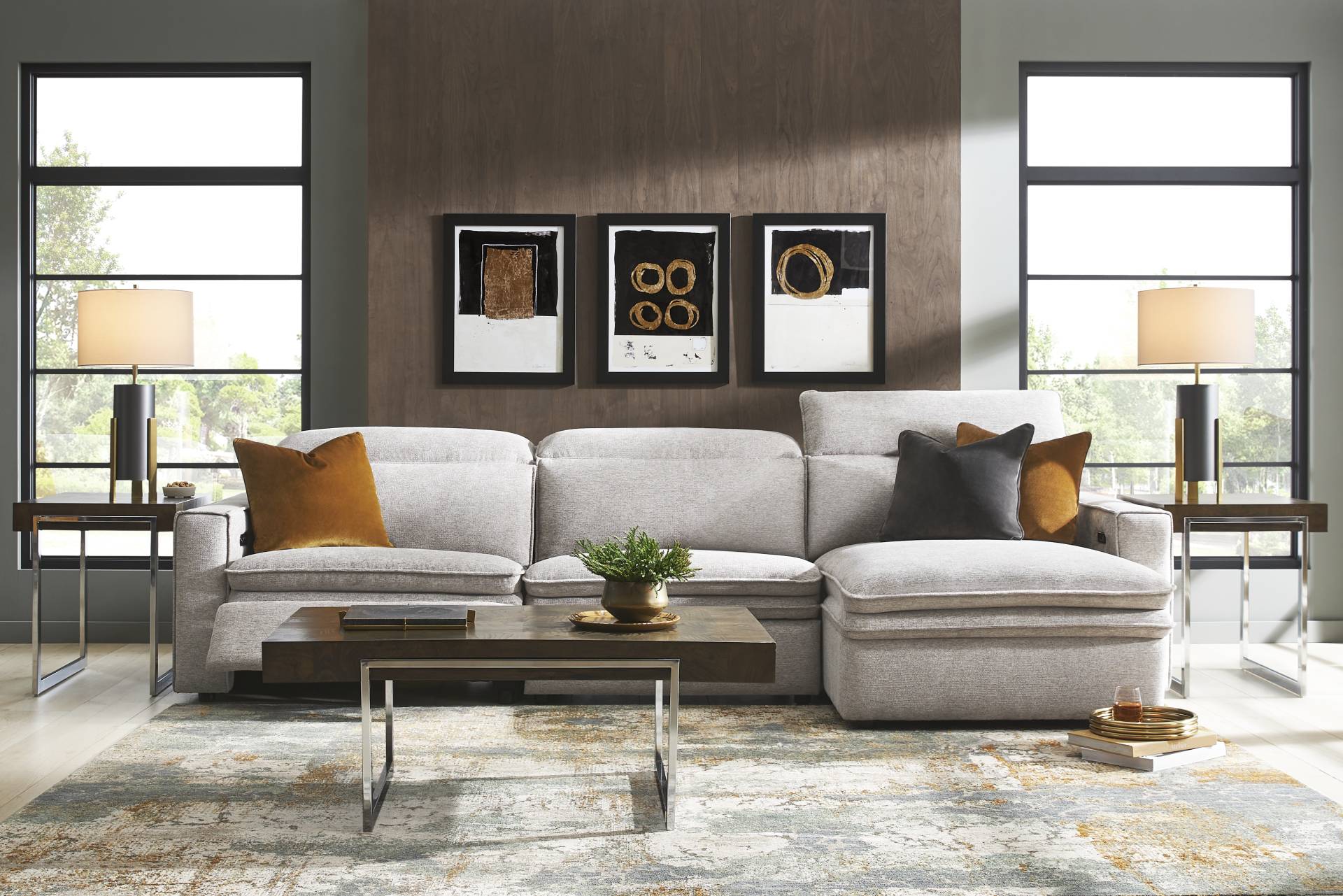 Sleek, chic, and altogether unique, the Drew & Jonathan Salvator Street sectional's spacious seating and seamless functionality is the perfect blend of modern comfort and urban sophistication. Upholstered in a woven fabric, this sectional features stylish track arms and attached double pillow pad seat cushions for a luxurious feel. The dual power reclining feature allows adjustment in the head and footrest for personalized support while the chaise allows adjustment in the headrest for the ultimate lounging experience. Upholstery: 100% Polyester.