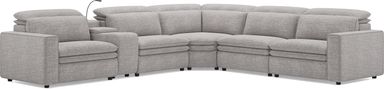 Sleek, chic, and altogether unique, the Salvator Street sectional's spacious seating and seamless functionality is the perfect blend of modern comfort and urban sophistication. Upholstered in gray woven fabric, this sectional features stylish track arms, dark cylindrical legs and attached double pillow pad seat cushions for a luxurious feel. The dual power reclining feature allows adjustment in the head and footrest for personalized support while the chaise allows adjustment in the headrest for the ultimate lounging experience. Upholstery: 100% polyester.