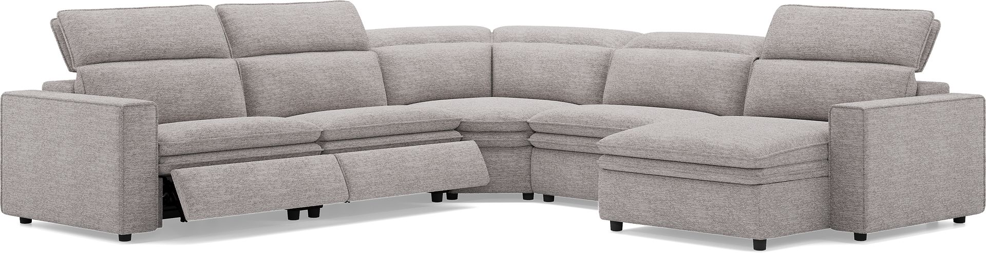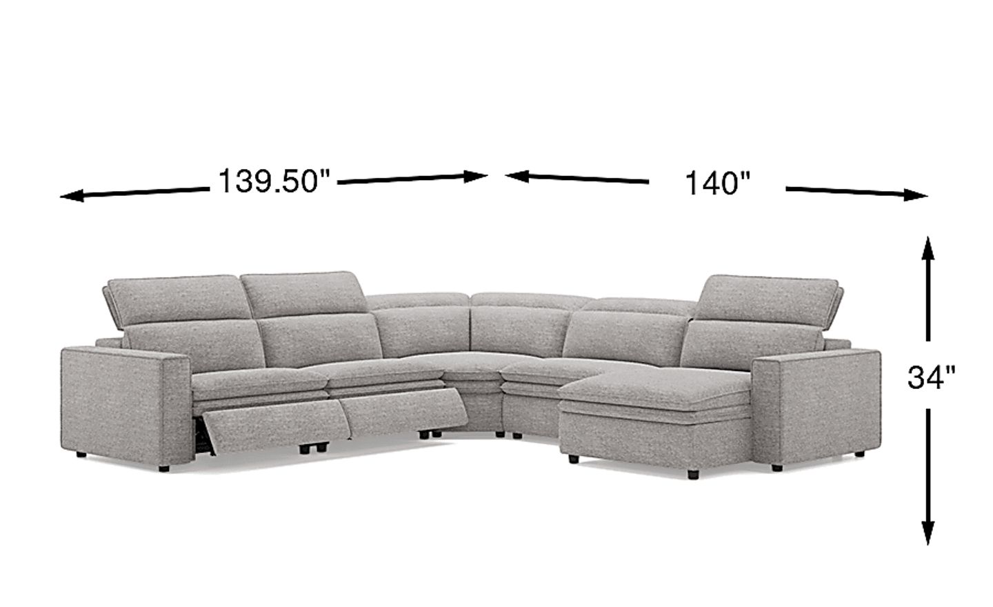 Sleek, chic, and altogether unique, the Salvator Street sectional's spacious seating and seamless functionality is the perfect blend of modern comfort and urban sophistication. Upholstered in gray woven fabric, this sectional features stylish track arms, dark cylindrical legs and attached double pillow pad seat cushions for a luxurious feel. The dual power reclining feature allows adjustment in the head and footrest for personalized support while the chaise allows adjustment in the headrest for the ultimate lounging experience. Upholstery: 100% polyester.