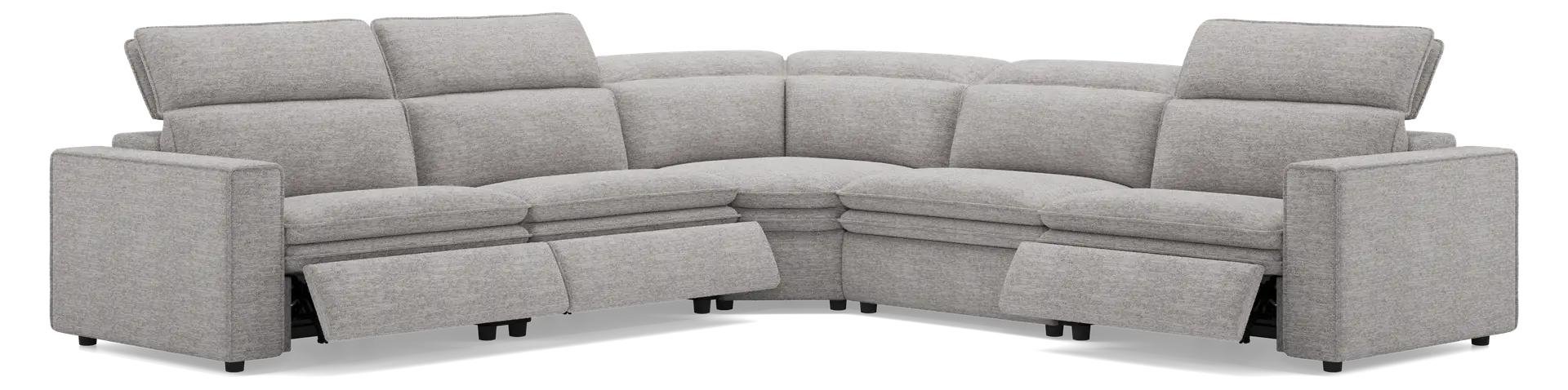 Sleek, chic, and altogether unique, the Salvator Street sectional's spacious seating and seamless functionality is the perfect blend of modern comfort and urban sophistication. Upholstered in gray woven fabric, this sectional features stylish track arms, dark cylindrical legs and attached double pillow pad seat cushions for a luxurious feel. The dual power reclining feature allows adjustment in the head and footrest for personalized support while the chaise allows adjustment in the headrest for the ultimate lounging experience. Upholstery: 100% polyester.
