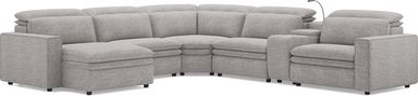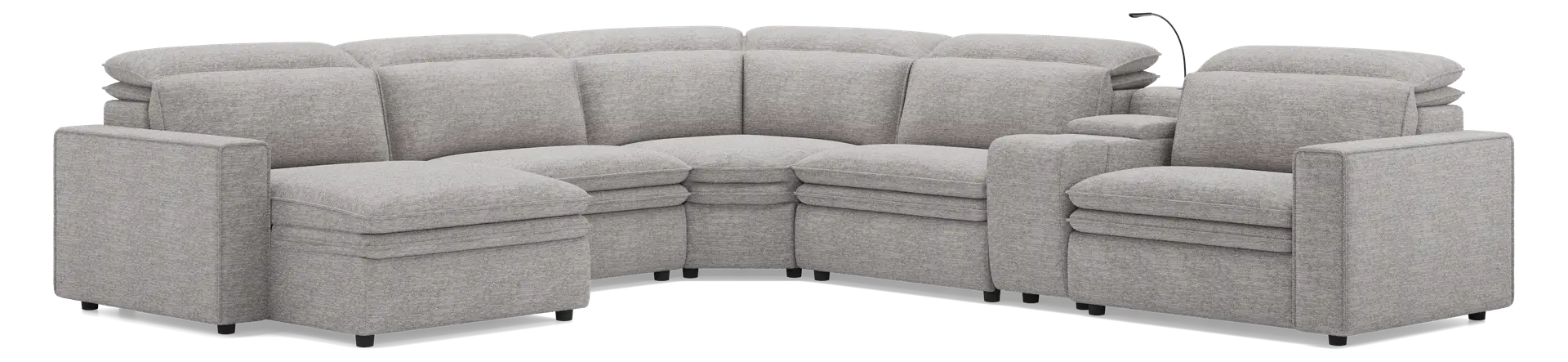 Sleek, chic, and altogether unique, the Drew & Jonathan Salvator Street sectional's spacious seating and seamless functionality is the perfect blend of modern comfort and urban sophistication. Upholstered in a woven fabric, this sectional features stylish track arms and attached double pillow pad seat cushions for a luxurious feel. The dual power reclining feature allows adjustment in the head and footrest for personalized support and the ultimate lounging experience. The media console includes a storage compartment, cupholders and a reading light for convenience. Upholstery: 100% Polyester.