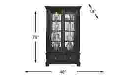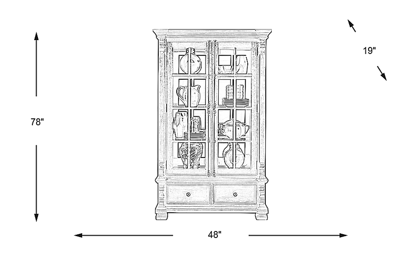 Bringing sophisticated, stylish storage right into your dining room, the San Luis china cabinet is the perfect item to showcase your favorite dishes or china. Crafted from wood solids and oak veneers, the glass framed doors open to three removable, adjustable shelves. Interior lights above the top shelf enhance your favorite pieces, and two lower drawers keep extra dishes or linens tucked neatly out of sight. The rich dark oak finish is exquisitely detailed with carved square feet, elegant column details, and round hardware. Dust proofing along the bottom helps keep your dishes free from dust.