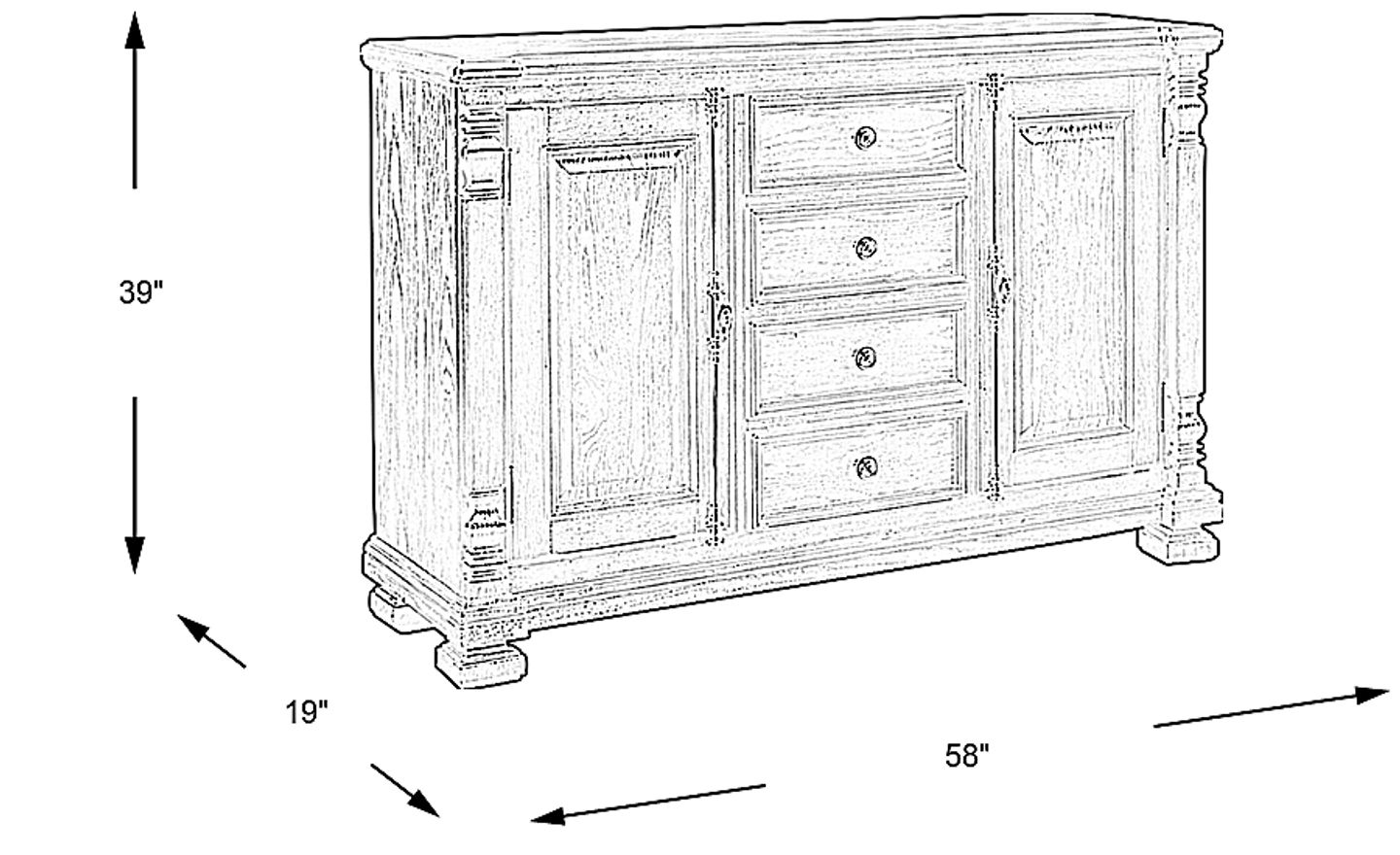 Organize your dining accessories with the San Luis sideboard. Behind each door, you'll find two removable and adjustable shelves, giving you plenty of space for storing larger, delicate dishes. Four middle drawers are ideal for organizing more shallow items, linens, or even silverware. Crafted from wood solids and oak veneers in a rich dark oak finish, the exquisite traditional style includes carved square feet and round hardware for added eye appeal. Dust proofing along the bottom helps keep your dishes free from dust.