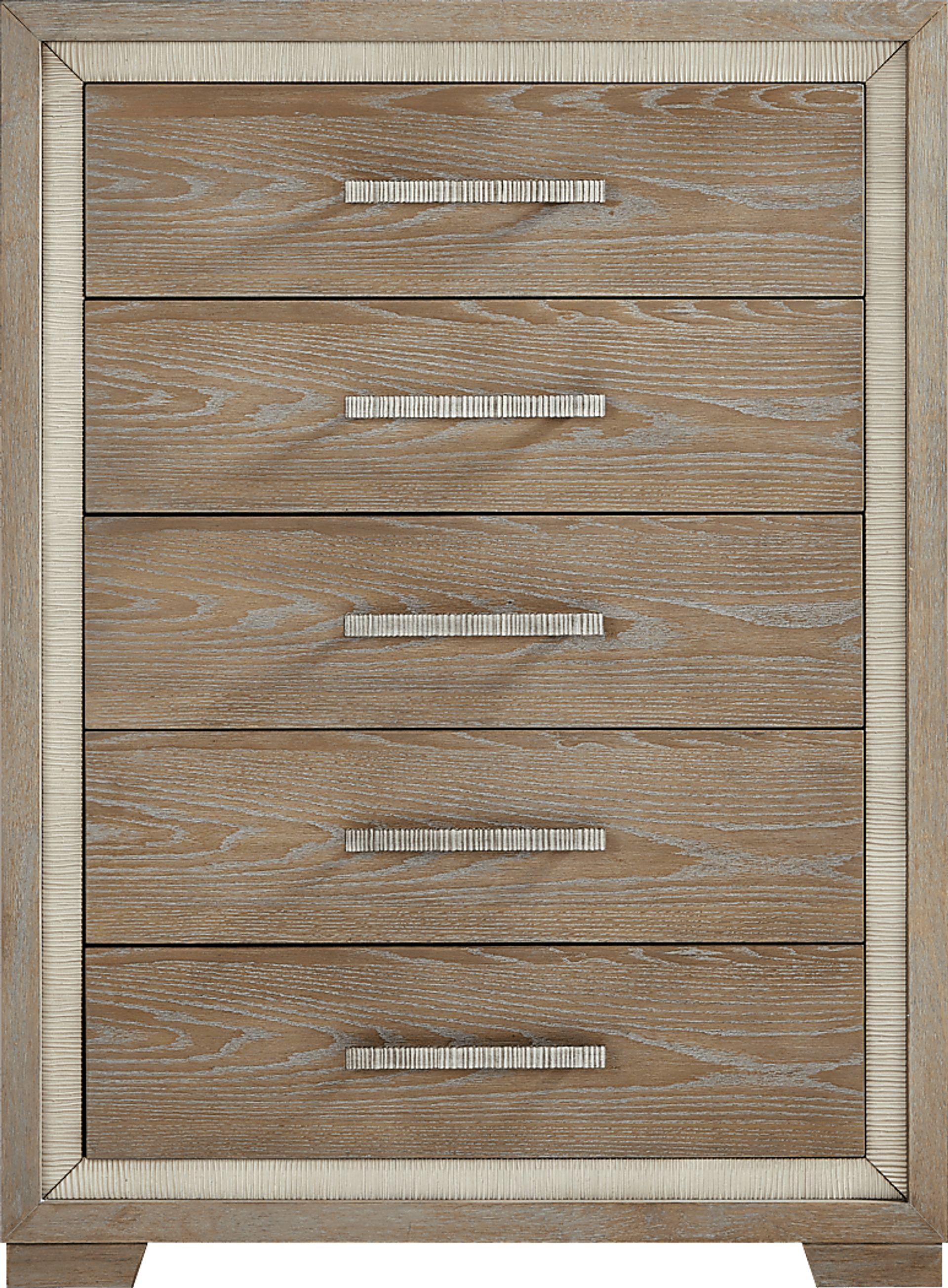 Red oak is a hardwood celebrated for its prominent grain and inherent strength. By using red oak veneers, this chest achieves a high-end, consistent look that highlights the natural texture of the wood. The sandstone finish provides a transitional, neutral palette that bridges the gap between coastal and contemporary styles, making it a versatile piece for a variety of bedroom decors.